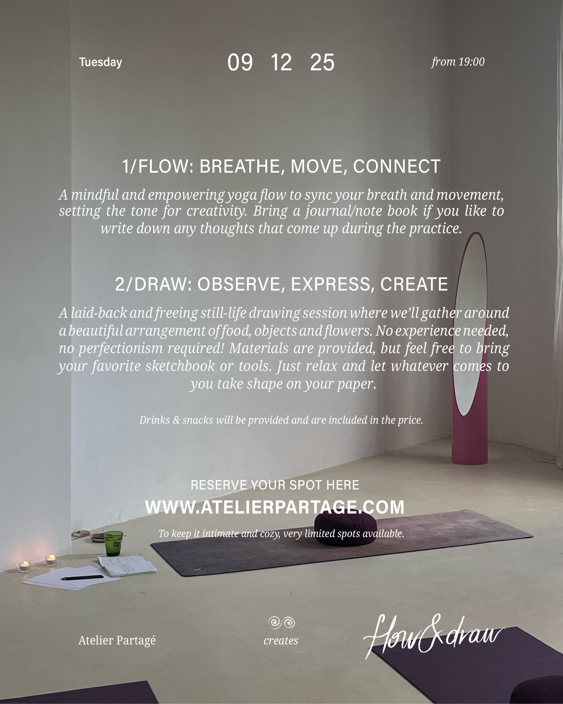 A laid-back and freeing still-life drawing session where we’ll gather around a beautiful arrangement of food, objects and flowers. No experience needed, no perfectionism required! Materials are provided, but feel free to bring your favorite sketchbook or tools. Just relax and let whatever comes to you take shape on your paper.